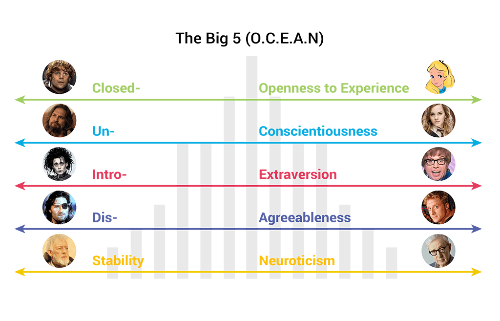 The five traits, under the acronym OCEAN, are treated on a spectrum where you can be open or closed to experience, conscientious or unconscientious, and so on.