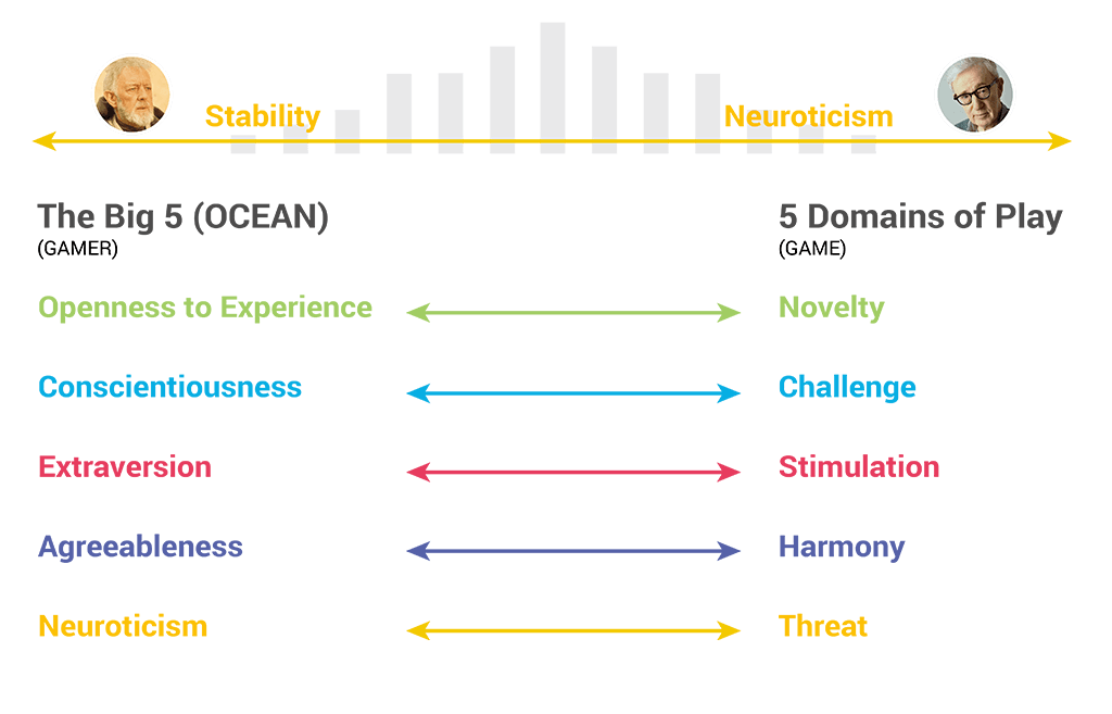 I decided to revisit The Big Five theory and the six facets behind each gamer-type. The goal was to make a transposition that would be applicable to my particular market niche.