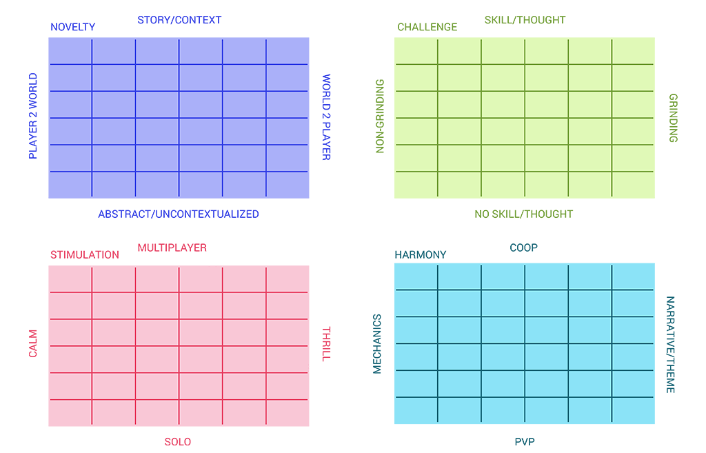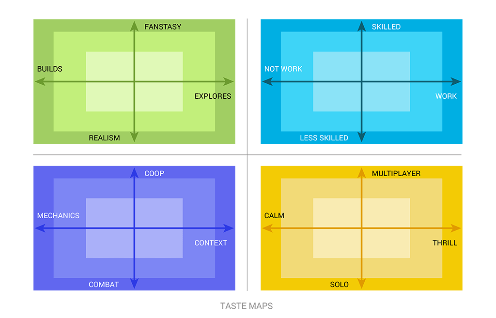 Vandenberghe developed the Taste Maps’ axes with a strong AAA and console background during his video game project, For Honor, at Ubisoft. Given my work experience in the casual mobile F2P industry at the time, his axes did not address the games I was developing.