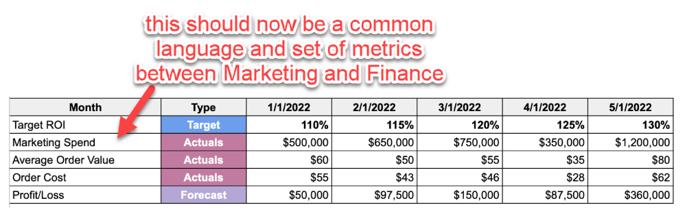 However, before you go down the route of building an entirely new reporting infrastructure, ask your finance team “what reports are you looking at every day?” Do you understand each finance KPI and can you tie them directly to your marketing KPIs? Specifically, compare the transactions and revenue that your marketing reports are showing against finance reports. Work on aligning them as much as possible—either by cleaning up conversion tracking, adding a multiplier to your conversions, or (ideally) pulling finance numbers into your marketing reporting.