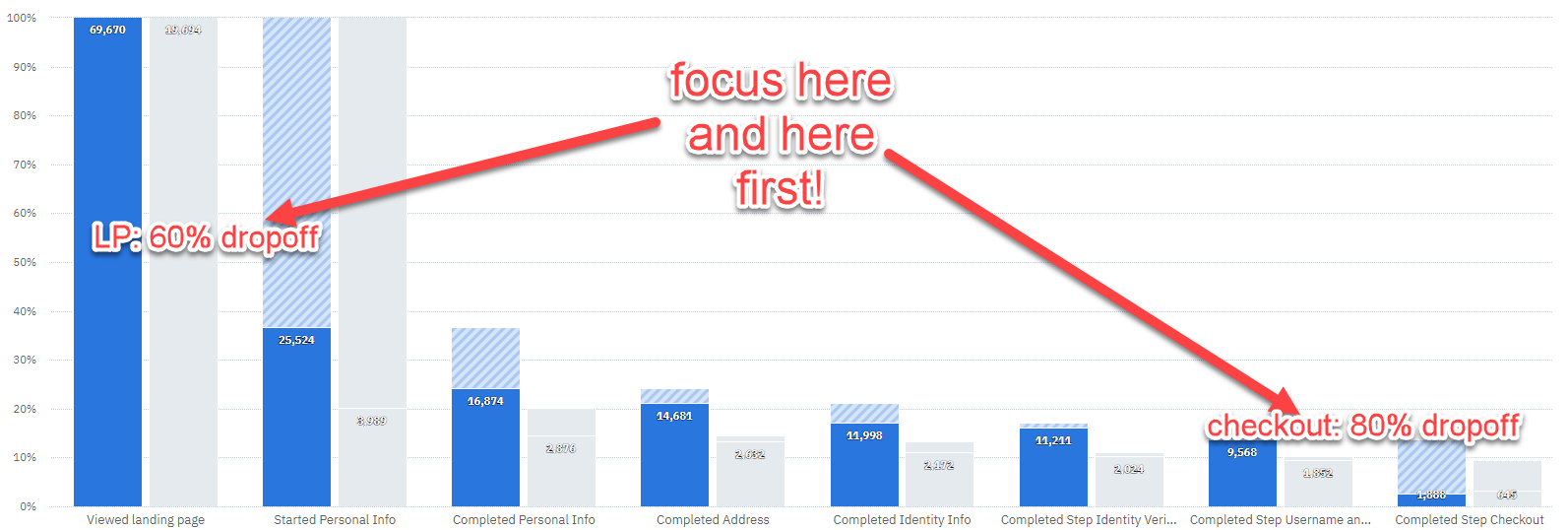 First off, let the data inform your area of focus. Below is one of our conversion funnels for a credit monitoring site for which we spend $500k/month in SEM. The largest drop-offs occur on the landing page (60% dropoff) and checkout (80% dropoff). Every other step is relatively negligible.
