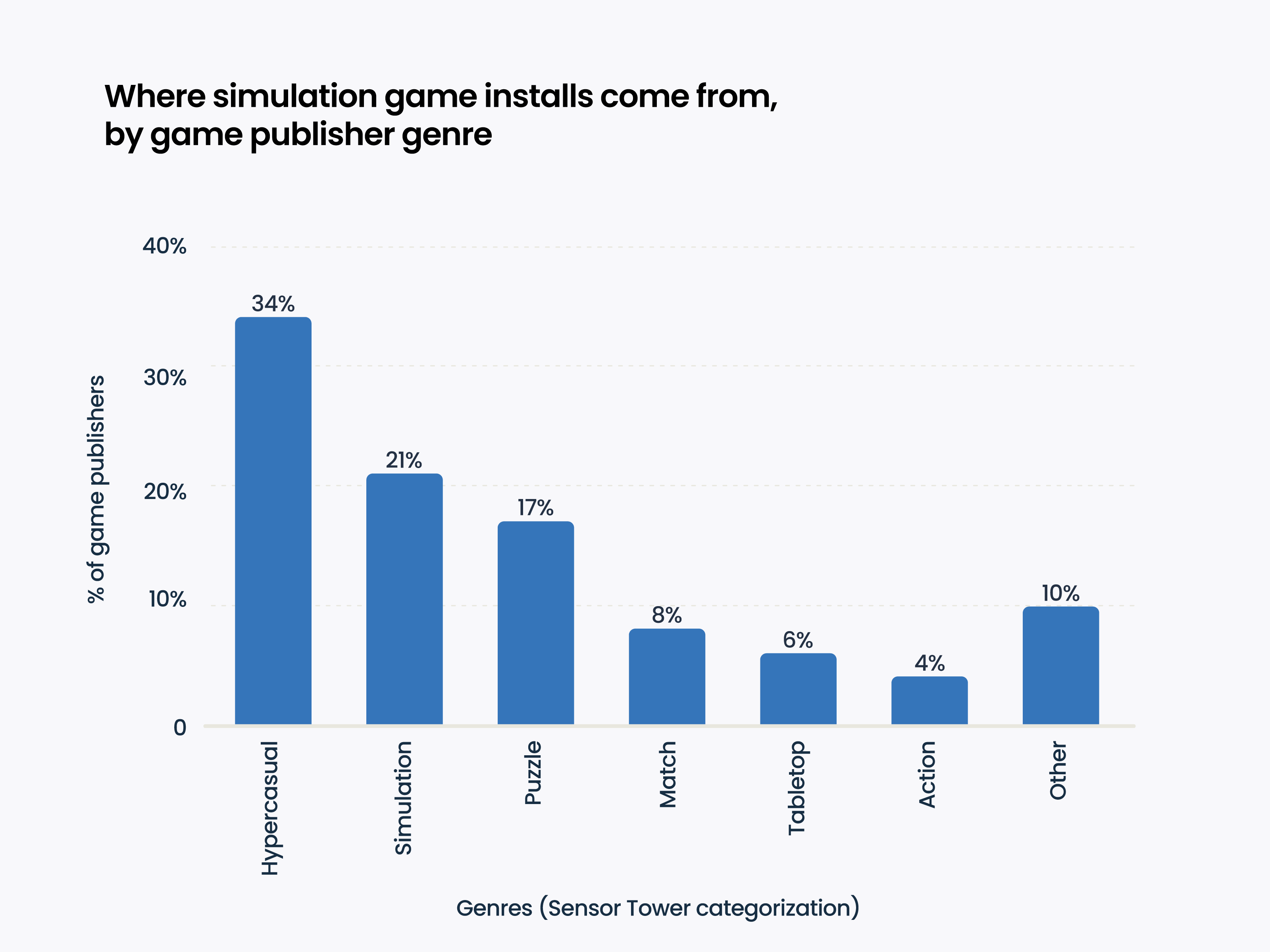We see a slightly different picture when looking at simulation game downloads sourced from game publishers. While hypercasual games are still the largest source at 34%, other simulation games contribute a notable 21% to installs. Puzzle comes in a close third at 17%.