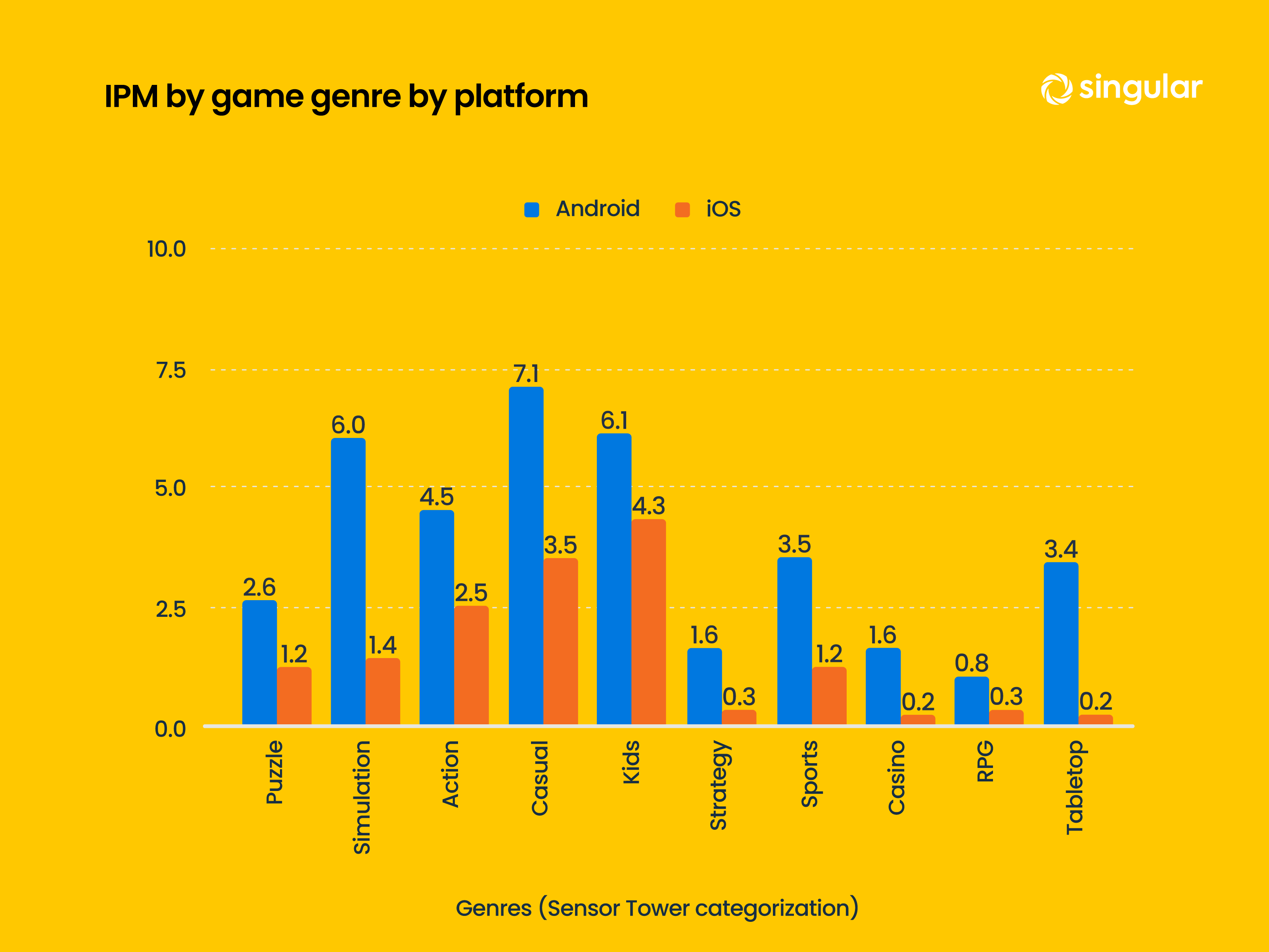 RPG titles tend to rely on higher-engagement players who spend on in-app purchases (IAPs). Kids games see the highest IPM on iOS at 4.3 and the second highest on Android at 6.1.