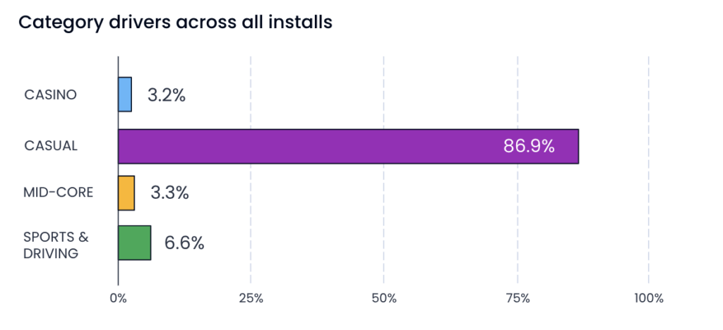 Puzzle games are a similarly impactful driver at 31.3%, and simulation and lifestyle games form the next tier, each driving around 9% of total installs. Mid-core genres such as strategy and card games tend to be more niche in their interests and make a smaller contribution across genres.