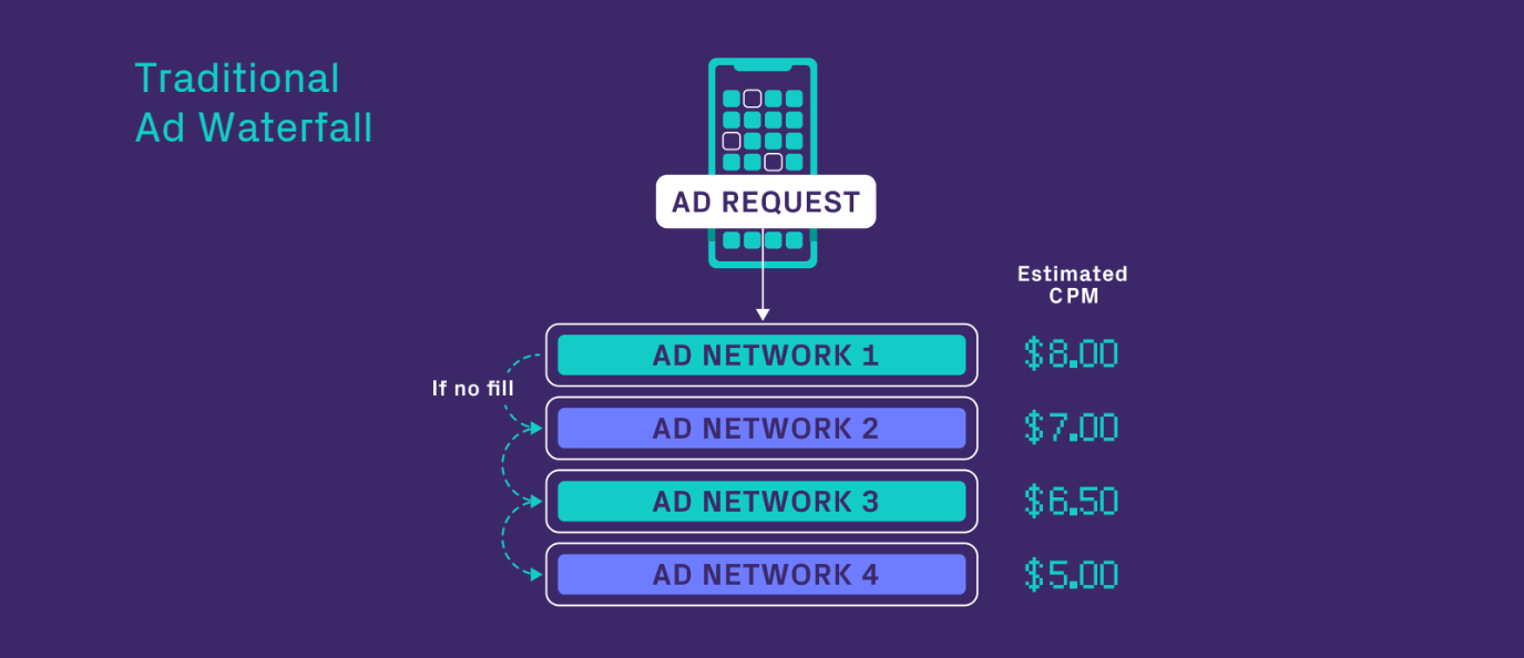 In-app bidding solves that issue since all demand partners are called simultaneously, and the fastest, highest bidder gets the impression. It basically eliminates the risk of the broken waterfall method.