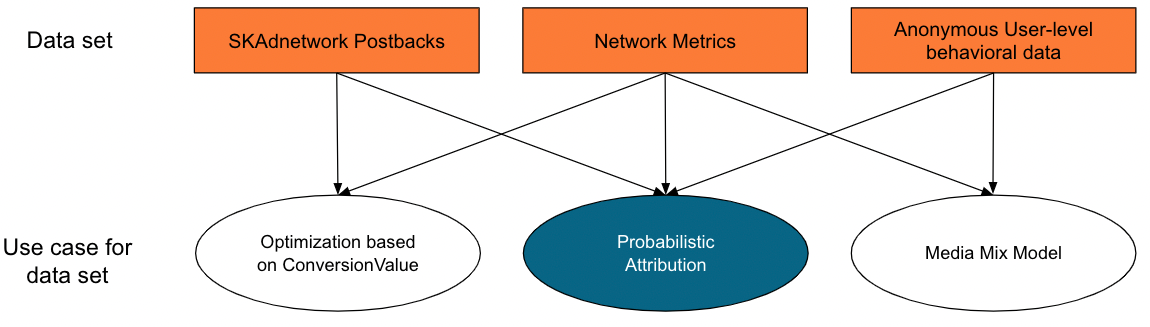 Shown in the diagram above – the probabilistic attribution solution (we should note here that this is not a so called “fingerprinting” approach) is the only use case for the data which leverages all three datasets to their full potential. Measuring performance using only SKAdNetwork conversion values, as explained earlier, ignores the richer set of user data, resulting in a stale rather than a dynamic picture of campaign performance.